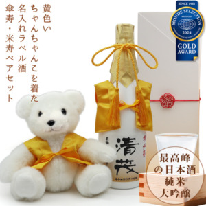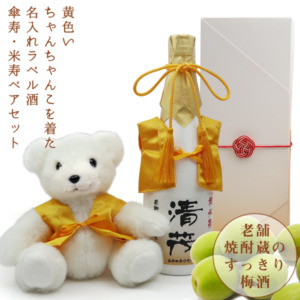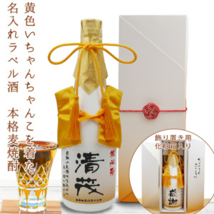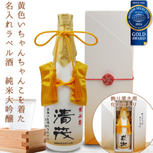 黄色のちゃんちゃんこを着た 名入れラベル酒